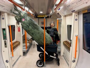 Maeve with a Xmas tree in a train